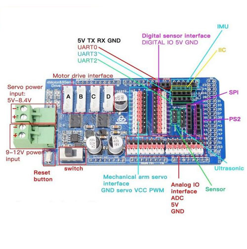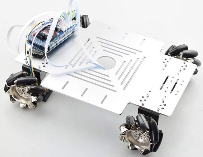 The kit ships with wheels, motors with encoder, driver board, PS2 controller, and everything you need to get started. As the name suggests, the chassis has 20kg payload capacity.