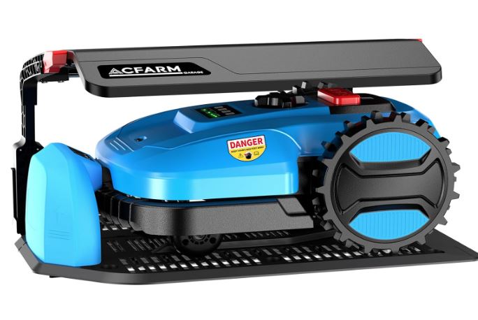 This is the ACFARM Blue RR 500 Robotic Lawn Mower: another app connected mower that cuts your grass without you having to break a sweat. This particular model is ideal for 0.25acres lawns. It can handle 47% slopes. To get started, you simply have to install the charging base and perimeter wire, and connect the mower to your phone.