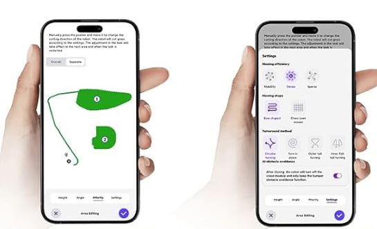 This robot has a Flowcut mulching chamber and uses a high speed fan to lift clippings off the ground. It has an adjustable cutting height of 3 to 9 cm. It can handle grass up to 15cm tall. This robot uses VSLAM to stay on track even when GPS is weak. The app lets you adjust cutting height and angle.