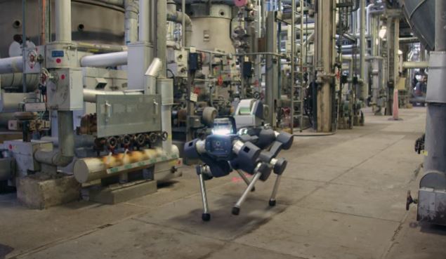 The ANYmal is a 4-legged robot that can perform industrial inspections. It can patrol complex, harsh environments while collecting data autonomously. It can overcome 25cm steps and slopes up to 30 degrees. This robot is IP67 water and dustproof. It has built-in depth sensors to avoid obstacles.