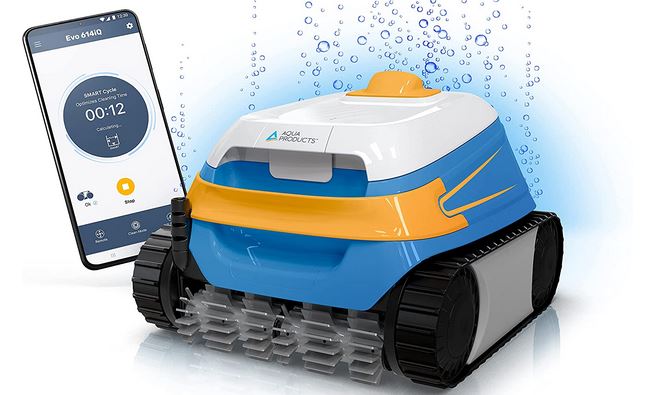 Here is another robot that combines with your iOS or Android device to make it easier to clean your pool. The Aqua Evo 614 iQ Robotic Pool Cleaner comes with 2 cleaning moods. It can move on the floor and walls to get rid of stubborn dirt. This robot is ideal for swimming pools up to 50ft. It can work on vinyl, fiberglass, pebble, tile, and other surfaces.