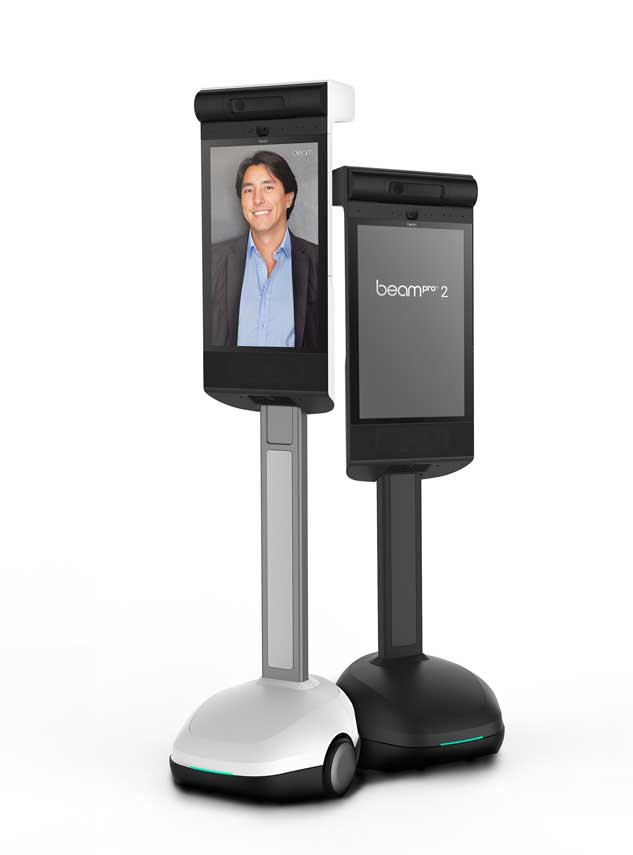 Meet the BeamPro 2: a telepresence robot with a 24″ LCD display, multitouch functionality, ambient light sensors, and height adjustment that allows your team members to collaborate with others across the globe. It can maneuver in tight spaces and turn on a dial.