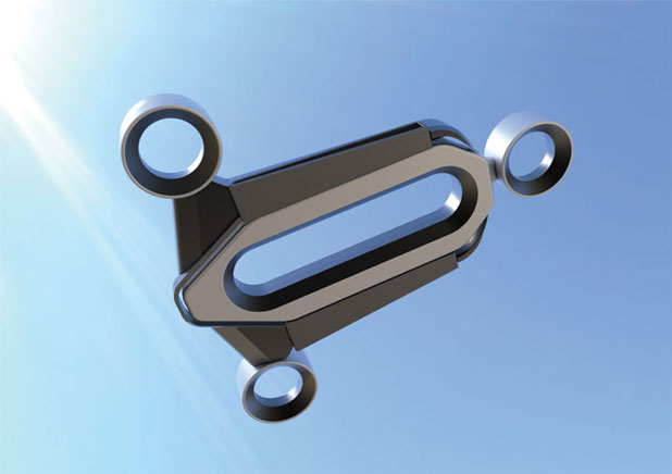 The Bladeless Drone takes the air and accelerates it through internal ducts and blades. The two front propellers can rotate 20 degrees forward and backwards. The back propeller rotates 20 degrees clockwise and counter clockwise. Edgar Herrera is behind this design.