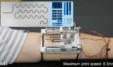 Meet the BodyPrinter: a robot capable of fabricating circuits directly on skin. It is made with an Arduino with CNC shield, stepper motors, geared DC motor, and other simple components. The robot has max printing speed of 8.3mm/s.