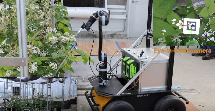 BrambleBee drives around the area to inspect plants and update its map. Since Bramble flowers can be self-pollinated, BrambleBee doesn’t need to get pollen from other flowers. The robot is mainly based on a ClearPath Robotics Husky platform with a Kinova Jaco robotic arm.