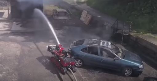 This is the Colossus from Shark Robotics: an unmanned ground vehicle that can take on various rescue missions, including fires. It can navigate rubble, debris, and other challenging terrains. It has LiDAR, cameras, and thermal imaging. This robot has a water cannon with a performance of 2000L/min. It has a 320-degree video turret.