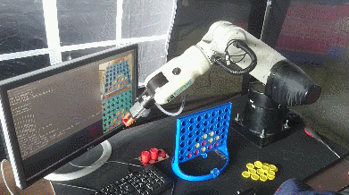 Here is another robot capable of playing games against humans. The CRS A465 robot has 6 degrees of freedom and is controlled by an Odroid XU4. Its interface and game logic (modified Negamax algorithm) are written in multi-threaded Python, allowing the robot to play Connect Four against human opponents.
