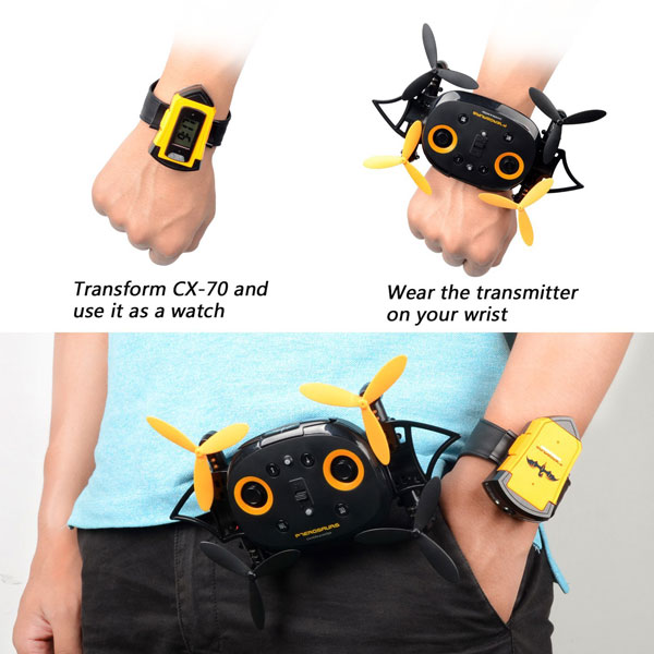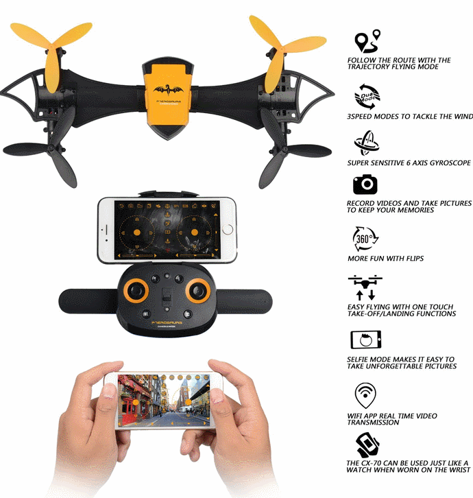 Meet the Cheerson CX-70 Bat Drone: a selfie quadcopter that can also be worn like a wristwatch. It holds its altitude and can be flown indoors or outside. It has 3 speed option to accommodate beginner to more advanced users. The CX-70 Bat Drone has a 0.3MP camera for selfies.