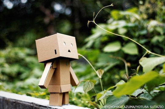 Meet the Danboard: a robot inspired by Danbo from Yotsuba&! that can move its head, arms and legs. It also has eyes that light up. Its CPU board lets you play funny noises through the robot. This cardboard box robot weighs about 800g. It runs on AAA batteries and has an optional wireless controller.