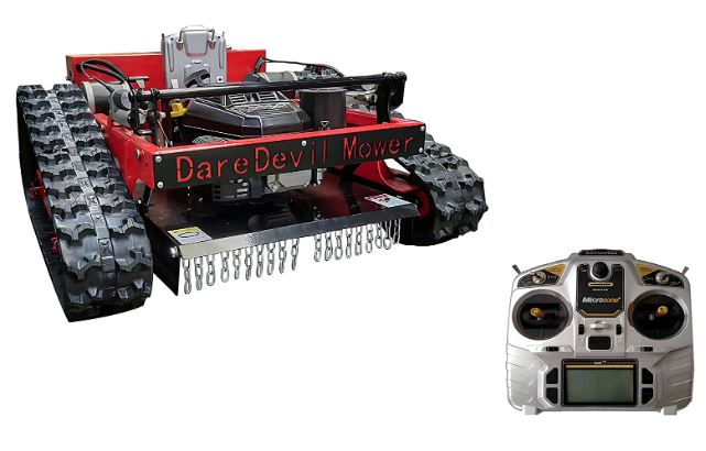 Here is another powerful robotic mower with a KOHLER 8HP Engine that can cut grass without you having to break a sweat. The Daredevil Hybrid RC Robotic Mower can be operated from 260 meters away. It can climb inclines up to 45 degrees.