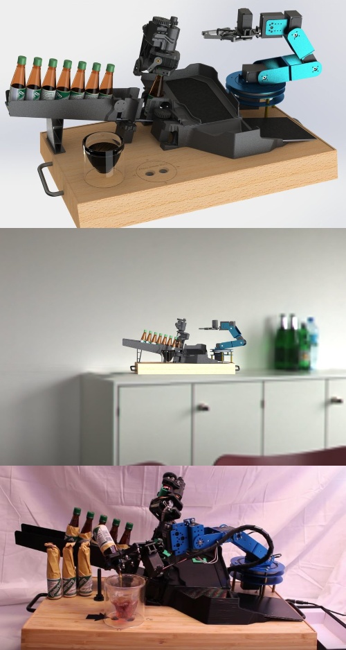 Here is a robot that can pour you a drink, collect the cap, and deposit the bottle into a recycle bin. The Desktop Bartender Robot is developed by Seearress Designs. It comes 100% assembled. You simply need to use herbal bitter mini drink bottles to get this machine working. The above GIF shows how this robot works.