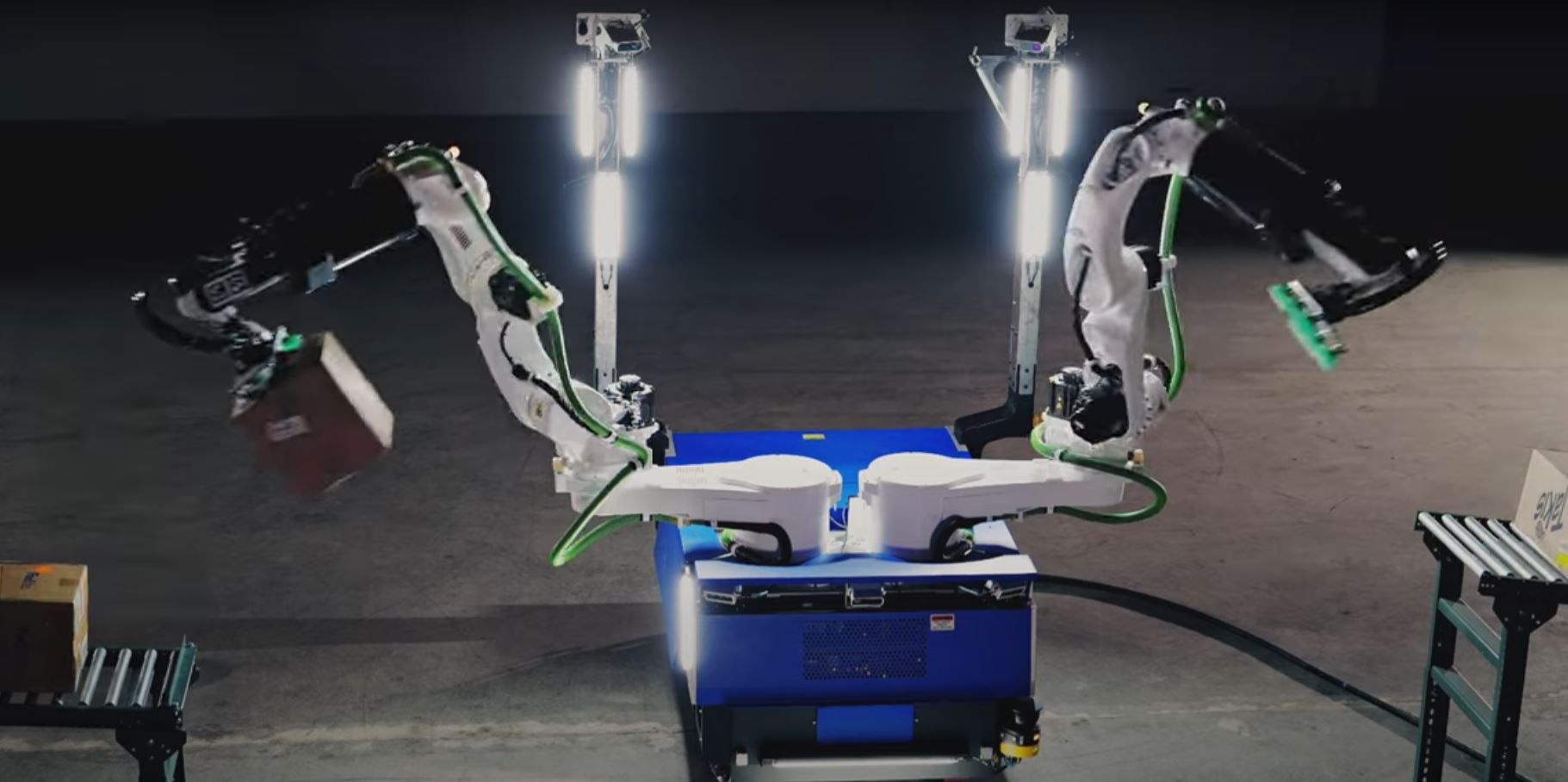 This is the Dexterity Mech: an AI powered robot that can operate in complex, unstructured environments. It can handle and move items like humans. Mech features 2 arms that it uses for palletizing and truck loading. Its vertical reach extends beyond 8 feet.