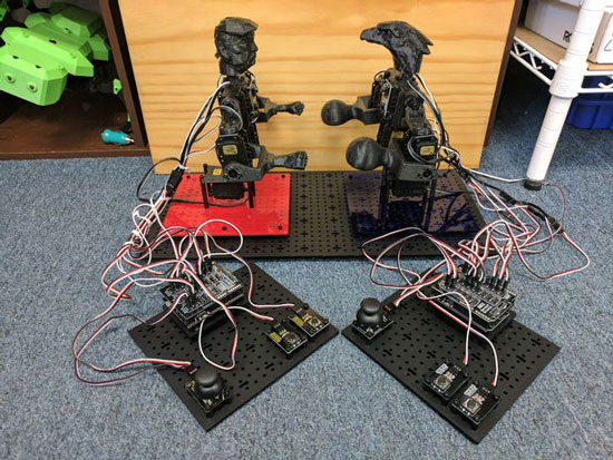 Here are a couple of cool robots that can pan, tilt, and throw fists. Trump vs. Eagle Man Rock’em Sock’em Robots are built using a RobotGeek Geekduino, sensor shield, Duino mount, joystick, 6 x 180 servos, and a few other parts. You will also need a 3D printer.