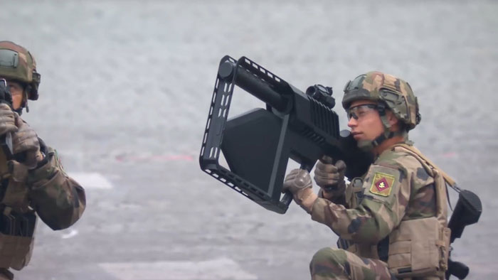 GPS, GLONASS disruption is optionally available. The entire rifle weighs 16lbs with two batteries. This tool allows for controlled management of drones carrying explosives.