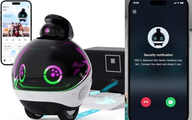 This is the EBO X: a smart family robot that can detect falls and cries to alert your family. It supports two way communication. This robot has Alexa and V-SLAM navigation. It has a 4K 8MP stabilized camera with color night vision. It has a self-balancing two-wheeled design, so it can move around your home and turn 360 degrees.
