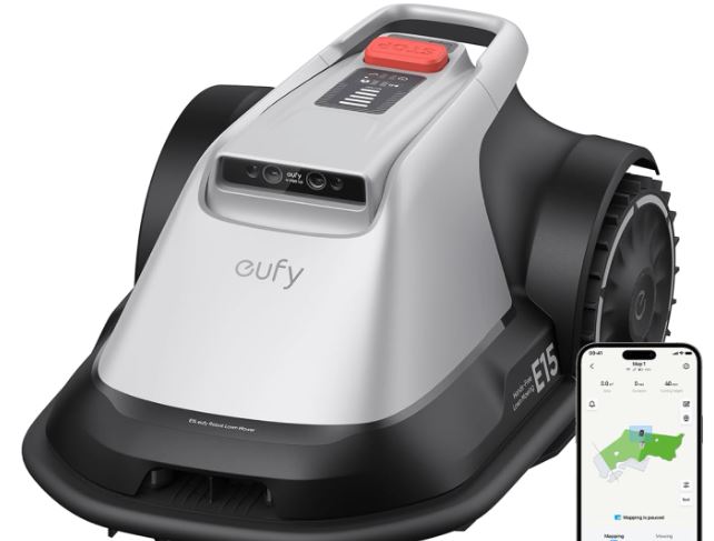 This is the eufy E15: an app connected robotic mower with vision FSD technology that can map your lawn automatically. It can get the job done without a boundary wire or RTK station. It has an adjustable cutting height of 1 to 3 inches with a cutting width of 8 inches. The E15 and E18 models have a recommending mowing size of 0.2 acre and 0.3 acre respectively.