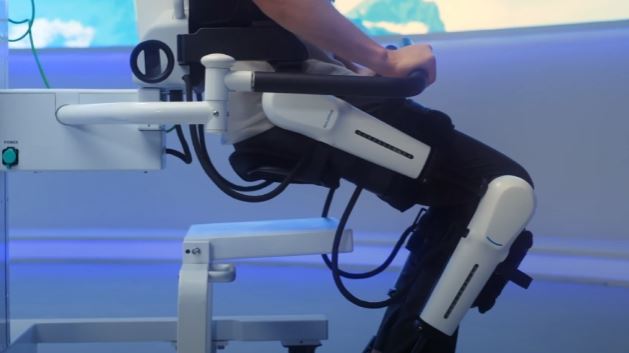 This is the ExoMotus M4: a lower limb exoskeleton robot that helps patients recovering from a stroke or dealing with spinal cord injurie. It helps patients walk and train in passive, assistive, motive, and resistance modes. It enables users to achieve rhythmic walking and minimize abnormal gait patterns.