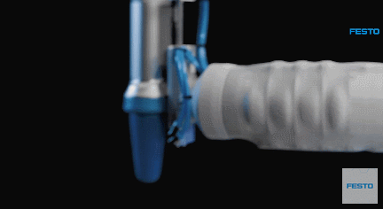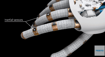 When the chambers are filled with air, the gripper fingers bend. If the air chambers are empty, the gripper fingers remain stretched. The thumb and index finger are additionally equipped with a swivel module, which allows these two gripper fingers to be moved laterally. This gives the bionic robot hand a total of twelve degrees of freedom.