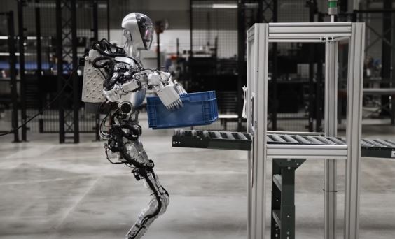 This is the Figure 01 Robot: an autonomous humanoid robot with hands that can open doors and use tools. It stands 5’6″ tall, weighing 60kg. It has max speed of 1.2m/s. It has payload capacity of 20kg. As this video shows, Figure can now pick up and move bins onto the conveyor.