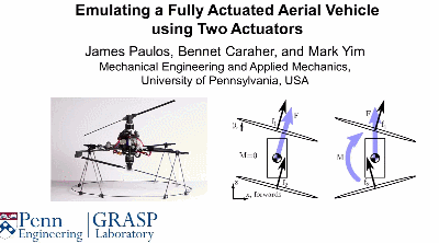 Here is a fully actuated aerial vehicle that uses two actuators for position and orientation control. As Modlab UPenn explains, this aircraft can accurately track trajectories with lateral accelerations in excess of 1m/s2. That means all 6 degrees of freedom during flight are controlled with the 2 actuators.
