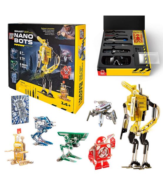 Here is another robot that gets your kids familiar with technology concepts. The GeeekClub 7-in-1 Robotic Kit comes with circuit boards, diodes, wires, light sensors, and everything you need to build 7 robots. It comes with over 250 electronic components and 70 parts.
