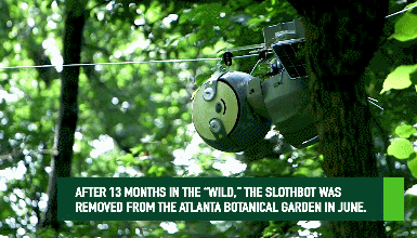 Here is another robot inspired by nature that can monitor its environment and collect valuable data. Georgia Tech’s Solar Powered SlothBot spent month in the wild but was recently removed from the Atlanta Botanical Garden.