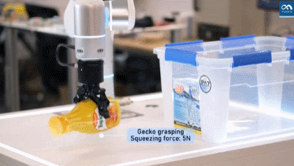This is the Grav Enhanced from Flexiv Robotics: a 2-in-1 robotic gripper that can handle a variety of objects, from groceries to automotive parts. In gecko grasping mode, this gripper uses gecko adhesive film technology to achieve firm grasps while minimize squeezing. It has max load capacity of 11lbs.