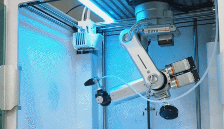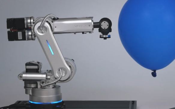 Here is 6-axis industrial robot arm that easily fits on your desk. The HARO380 has repeatability of 0.05mm and 500g capacity. You can mount it to your wall or desk to automate things. This robot has a visual programming interface. It has magnetic end effectors, so you can change tools easily.