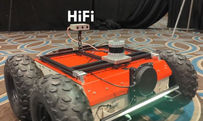 HiFi uses ams Mira220 cameras. It has a 136-degree DFOV. It can sync to your other sensors via GPIO. It can steam ROS 2 topics straight from the sensor. It is self-calibrating.