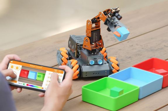 This robot supports Python programming. It has a HD camera and glowing ultrasonic sensor for obstacle avoidance. MasterPi is compatible with iOS and Android devices.