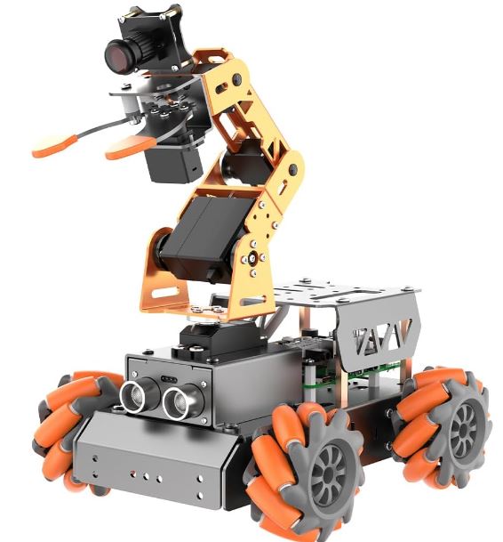 This is the HIWONDER Raspberry Pi 4B MasterPi Robot: a programmable robot with mecanum wheels that can take your coding to the next level. MasterPi has a 5DOF robot arm. It can recognize and locate objects. You can control this robot with your smartphone. It is ready for target tracking and line following.