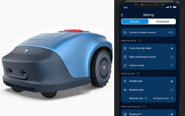 This is the HOOKII Neomow S: a parallel mowing robotic lawnmower with GPS, Bluetooth, WiFi, and 4G connectivity that cuts grass more efficiently. It runs on a 4400 mAh battery and can cover 3230 sq.Ft on a single charge. You can use your phone to put the robot on a schedule and set mowing mode.
