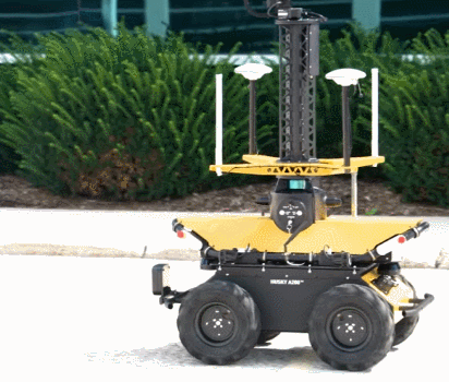 This is the Husky Observer: an inspection robot designed for dangerous jobs. It has built-in cameras and front/rear driving lights for navigation in challenging environments. It can be controlled via a web browser. This robot relies pan-tilt-zoom camera, front and rear stereo cameras, or 3D LiDAR to complete its job.