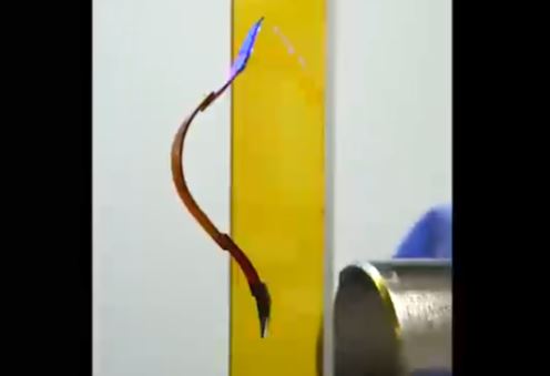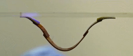 This 4cm long, 3mm wide, one mm thick robot can climb on a vertical wall. Its light-responsive polymer strip simulates the motion of an inchworm while gecko-inspired magnet pads are for gripping.