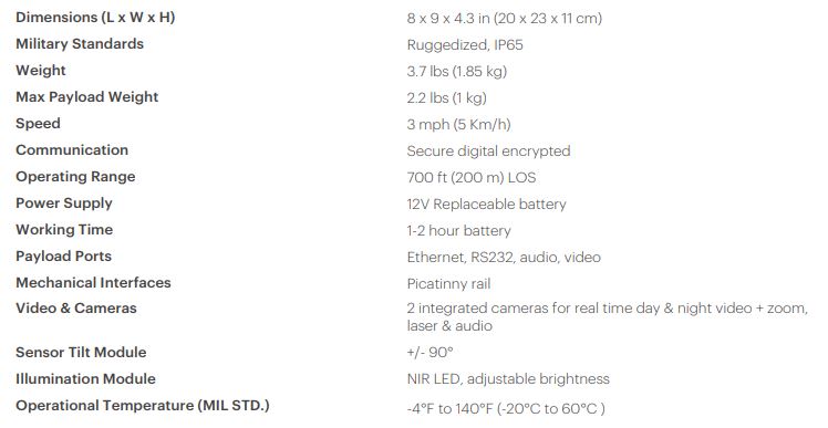 The robot has a max speed of 3 mph and runs for up to 2 hours on a 12V power supply. It also comes with a Picatinny rail interface, LED module, and video cameras. The IRIS is compact enough to enter and navigate in confined spaces above or underground. Here are the specs: