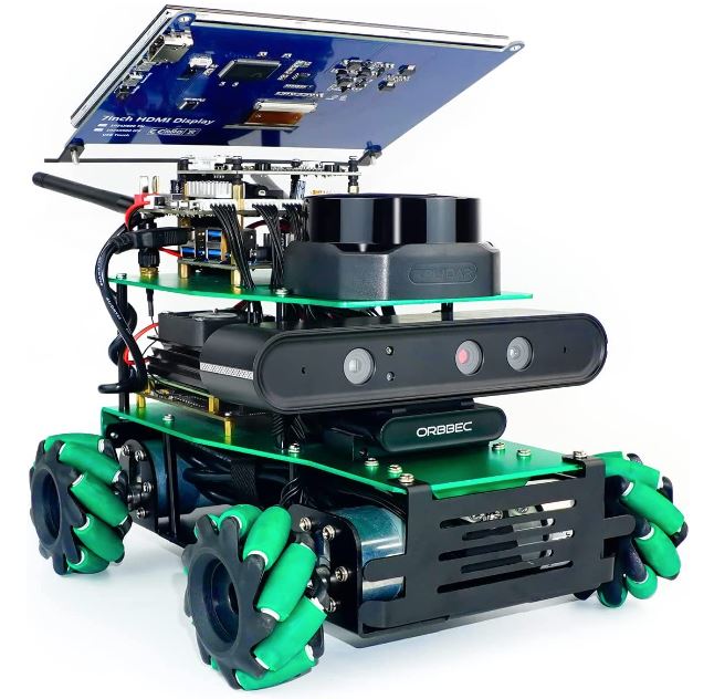 The X3 has mecanum wheels to move in all directions. It also comes with a 7-inch LCD screen. It runs on a 6000mAh battery. You can use the companion app for remote control, mapping and navigation. This robot can be used for self driving, obstacle avoidance, LiDAR tracking, and a whole lot more.