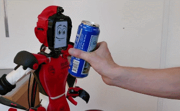 Here is a humanoid robot on wheels with face detection, product recognition, and face recognition that can bring you a drink. Joey can recognize different people. It can differentiate between different products to bring you the right one.
