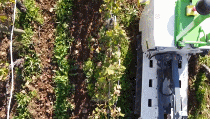 This is the Jo Robot: it is an autonomous crawler designed for narrow vines. It is 100% electric and can operate at speeds up to 2.2km/h in autonomous mode. It comes with GNSS RTK guidance system for navigation.