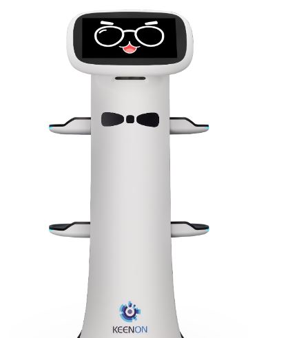 This is the KEENON T8: a fully autonomous food delivery and restaurant robot that can go through narrow paths and bring food to customers. It features smart obstacle avoidance and agile movement. This robot has a tray with 300-degree access. The DINERBOT has max speed of 1.2m/s with battery life of 15 hours. It has max load capacity of 20kg.