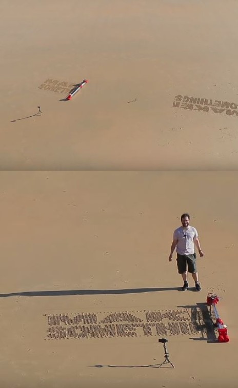 Here is a large sand drawing robot that can etch letters in the sand. Once the device is set up and its batteries are installed, it goes to work to draw letters in the sand that can be seen from the air.