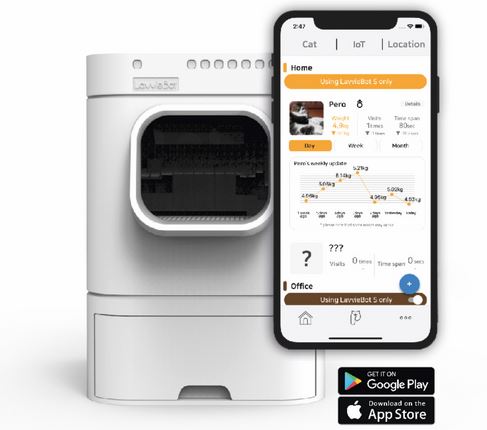 This robot works with the PurrSong app. The LavvieBot S has 6.5L extra storage space. It has 3 sensors to recognize each cat and ensure their safety. The companion app lets you monitor litter and waste levels and litter box usage.