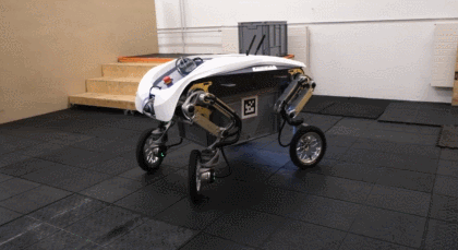 This robot can transition between rolling and walking. It can rotate while carrying a payload. The above video shows it in action.