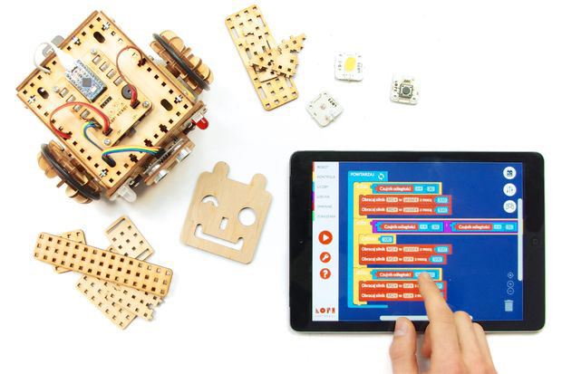 There is no better way to learn robotics than building your own and experimenting. The LOFI Arduino Robot is a DIY robot with lasercut wooden blocks that you can get working with an Arduino, breadboard, 2 DC motors, Bluetooth module, and a few other parts. With LOFI Blocks, you learn how to program robots on your iOS or Android device.