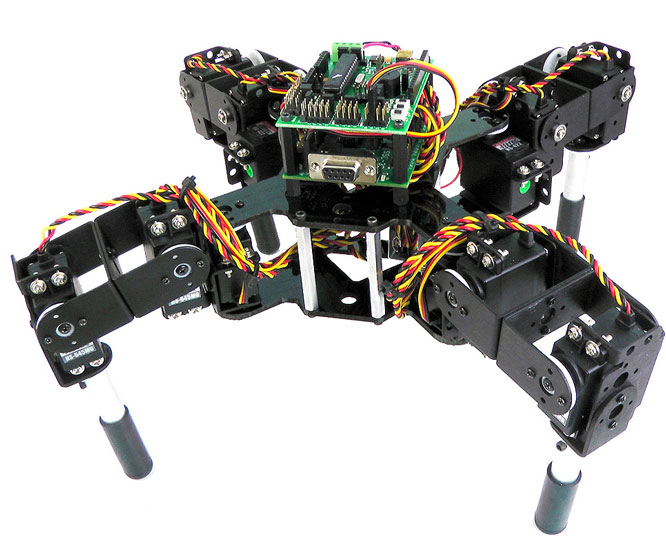 Here is another quadruped walking robot with everything you need to get started in coding robots. The Lynxmotion SQ3U robot comes with SSC-32 servo controller and the BotBoarduino microcontroller. It has 3DOF per leg and uses 4 HS-645MG servos and four HS-422 servos.