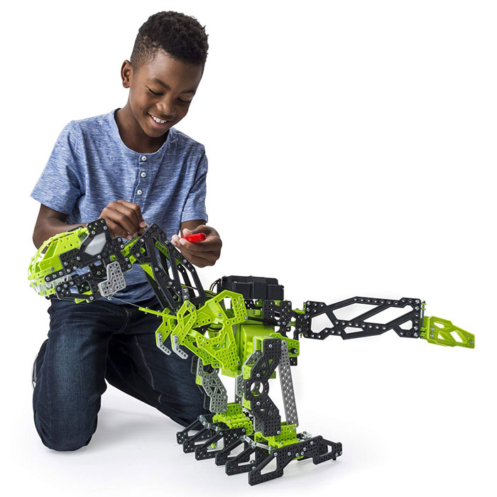 So you have a thing or two for dinosaurs? With the Meccano Meccasaur, you can play with a programmable robot T-Rex. It comes with over 700 parts for you to complete it. The kit consists of a motorized module, light-up LED, brain, and 2 tools. The robot responds to petting, can answer yes/no questions, and is even capable of guarding your room.