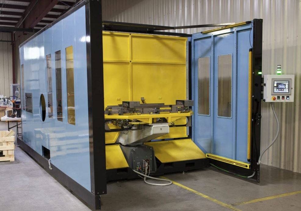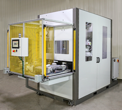 Here is a grind deburring cell that uses an ABB IRB 2600 robot and a multiple-purpose end-of-arm tool to remove excess material from die-cast aluminum parts. The MiniMAC Grind Deburring Cell returns each part to the operator when finished. It has a footprint of 5 x 7 x 7′. It comes with robot riser and sheet metal guarding.