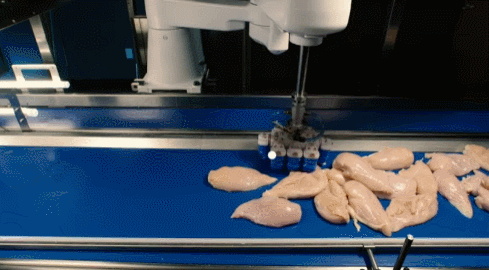 Here is a soft robot system for poultry automation. Soft Robotics’ mGripAI relies on AI and 3D vision to process food more efficiently. It has IP69K rated soft grippers which work with the intelligence module to pick items