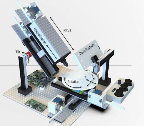 Arduino and Raspberry Pi are wonderful platforms for learning electronics and coding. MicroscoPy is a fun project that shows you what it takes to build your own open source microscope with Python, Raspberry Pi, Arduino, and LEGO bricks. It uses 6 stepper motors for rotation, magnification, and focus.