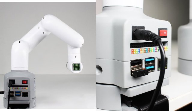 Meet the myCobot Pi: an educational 6DOF robot arm that can be programmed with Python and Blockly. It is powered by a Raspberry Pi 4B and has 4 USB, 2 HDMI, and other standard GPIO pins. It runs on Debian.