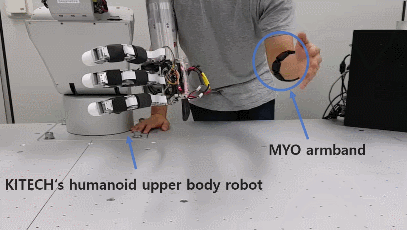 The Myo armband is a wonderful wearable device that can be used to control robots, drones, and apps. We have covered a bunch of cool Myo controlled robots here in the past. This video shows how KITECH’s humanoid upper body robot can be manipulated using this armband. EMG signals from the forearm are used to control a 2 DOF wrist and grasping movement of the hand.